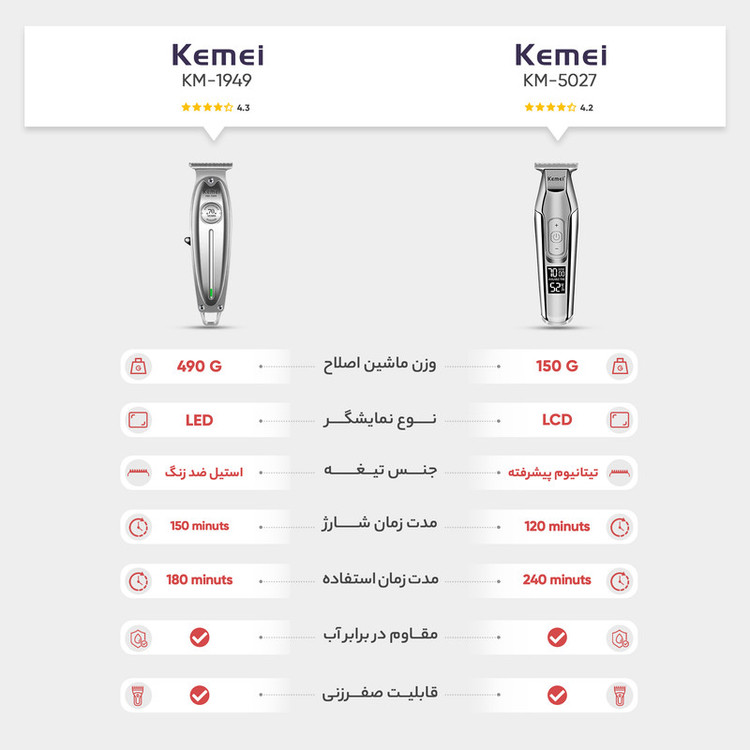ماشین اصلاح موی صورت کیمی ماشین اصلاح ریش Kemei، یکی از بهترین گزینهها برای افرادی است که به دنبال یک ریش تراش با کیفیت و قیمت مناسب هستند. این دستگاه اصلاح با کیفیت ساخت بالا و عملکرد قوی، توانسته است جایگاه خود را در بازار پیدا کند. با توجه به ویژگیهای منحصر به فردی که این ماشین اصلاح دارد، میتوان گفت که این محصول یکی از پرطرفدارترین محصولات در دسته خود محسوب میشود. از ویژگیهای بارز این ماشین اصلاح میتوان به طراحی زیبا و منحصر به فرد، عملکرد بینقص و قابلیت انطباق با انواع پوست اشاره کرد. علاوه بر این، نصب و استفاده از این دستگاه بسیار آسان بوده و به راحتی میتوانید از آن برای ترتیب دادن به ریش و موهای خود استفاده کنید. با توجه به تعداد زیادی از مشتریان راضی و تحسینکننده این ماشین اصلاح، میتوان به راحتی این نتیجه را گرفت که این محصول از کیفیت بسیار بالایی برخوردار است و توانسته است اعتماد بسیاری از مصرفکنندگان را جلب کند. ریش تراش کیمی ساخت کجاست؟ ماشین اصلاح ریش Kemei یکی از محصولاتی است که در کشور چین تولید میشود. این شرکت با نیروهای متخصص و با بهرهگیری از تکنولوژیهای پیشرفته و استانداردهای بین المللی، تلاش میکند تا محصولات با کیفیت و قابل اعتمادی را برای مشتریان خود تولید و ارائه دهد. این کمپانی با تمرکز بر کیفیت و اعتماد به نفس، به عنوان یکی از برترین تولیدکنندگان ماشین اصلاح ریش شناخته میشود. تلاشهای این شرکت برای ارتقای سطح تولید و ارائه محصولات با کیفیت، آن را به یکی از برترین برندهای این صنعت تبدیل کرده است. استفاده از تکنولوژیهای پیشرفته در تولید ماشین اصلاح ریش Kemei، موجب شده است که این محصولات با کیفیت و با قابلیت اطمینان بالا، توانایی ارضای نیازهای مشتریان خود را داشته باشند. مزایا و ویژگیهای ماشین اصلاح ریش Kemei ماشین اصلاح ریش Kemei یکی از بهترین انتخابها برای افرادی است که به دنبال یک ابزار قدرتمند و کارآمد برای اصلاح و ترتیب دادن ریش خود هستند. این ماشین اصلاح با داشتن تیغههای فولادی بسیار تیز و مقاوم، به شما امکان میدهد تا به راحتی و بدون اذیت پوست، ریش خود را به شکل دلخواه تنظیم کنید. همچنین با باتری قوی و مصرف کم انرژی، مدت زمان استفاده از این ماشین اصلاح را افزایش میدهد.