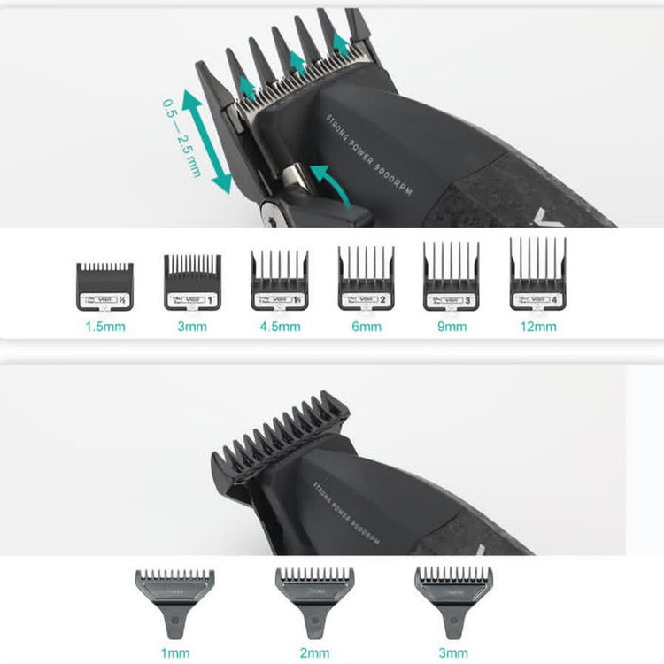 موتور پرسرعت 1.9000 دور در دقیقه: قدرت و دقت بینظیری را با موتور فوقالعاده کارآمد ما تجربه کنید، که برای حرکت آسان حتی در ضخیمترین موها طراحی شده است. سرعت 9000 دور در دقیقه، برش نرم و بدون گیر را تضمین میکند و زمان اصلاح را کاهش میدهد و در عین حال کنترل بهینه را حفظ میکند. 2. تیغههای روکشدار DLC و ریشتراش فویل تیتانیوم مشکی دوگانه: با تیغههای روکشدار کربن شبه الماس (DLC) ما، خطوطی تیز و تمیز به دست آورید - فوقالعاده بادوام، مقاوم در برابر خوردگی و ایدهآل برای اصلاح دقیق جزئیات. این کیت که با یک ریشتراش فویل تیتانیوم مشکی دو سر جفت شده است، اصلاحی بسیار دقیق و بدون سوزش را ارائه میدهد که برای پوستهای حساس و دستیابی به لبههای بینقص عالی است.با صفحه نمایش LED داخلی که به وضوح عمر باتری، تنظیمات سرعت و هشدارهای نگهداری را نشان میدهد، کنترل را در دست داشته باشید. دیگر نیازی به حدس و گمان نیست - جلسه اصلاح خود را به صورت زنده پیگیری کنید تا تجربهای بینقص داشته باشید. این کیت که با بدنه تمام فلزی براق و مقاوم ساخته شده است، ضمن تضمین دوام طولانی مدت، تجمل را به نمایش میگذارد. طراحی ارگونومیک آن به راحتی در دست شما قرار میگیرد و ثبات و کنترل را برای حالت دادن به موهای پیچیده ارائه میدهد. این مجموعه کامل شامل یک ماشین اصلاح قدرتمند، یک اصلاح کننده جزئی و یک ریش تراش فویل دوتایی است که هر نیاز آرایشی را - از محو کردن و باریک کردن ریش گرفته تا فرم دادن به ریش و اصلاح بدن - برآورده میکند. برای داشتن ظاهری آراسته، هر بار به راحتی بین لوازم جانبی جابجا شوید