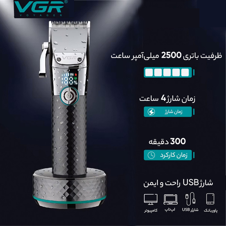 ماشینهای اصلاحی که مخصوص اصلاح موی سر ساخته میشوند، باید موتور قدرتمندی داشته باشند؛ زیرا موهای سر ضخیم بوده و نسبت به صورت و بدن تراکم بیشتری دارند. ماشین اصلاح V-256 ساخت شرکت «وی.جی.آر» با داشتن موتور لرزشی فوق العاده قوی با دور موتور بالای 7000 دور در دقیقه مناسب استفاده برای اصلاح موهای ضخیم با سرعت و قدرت بالا است. تیغهی ماشین اصلاح از جنس استیل حرفه ای پوشش داده شده با کروم است که در برابر زنگزدگی مقاوم است. به کمک این تیغه میتوان موهای سر را در اندازههای 0.8 تا 2 میلیمتر بدون شانه و با تنظیم از روی خود دستگاه کوتاه کرد.طراحی سیستم و بدنه این ماشین اصلاح کاملا بروز و مدرن و مدل آخر سال 2021 می باشد و رنگ آن نیز مشکی بسیار زیبا است و کار کردن با آن حس خوشایند کار با یک محصول با کیفیت را به شما می دهد. این محصول از باتری پر قدرت 2500 میلی آمپری بهره می برد که با 240 دقیقه شارژ میتوان به مدت 180 دقیقه از آن استفاده نمود. همچنین یک صفحه LCD جهت اطلاع از میزان شارژ باقیمانده و جهت نمایش دور موتور بر روی بدنه دستگاه تعبیه شده است. برای اصلاح مو در اندازههای مختلف 6 عدد شانهی اصلاح با طول برش 1.5 تا 12 میلیمتر ارائه شده که روی تیغه قفل میشوند. داخل جعبه برس تمیزکننده و روغن به همراه پایه شارژ و کابل نیز قرار داده شده است. تیغههای ماشین اصلاح در کارخانه تنظیم و روغنکاری شدهاند و ممکن است با بازکردن جعبه در اولین مرتبه، اثرات آن را مشاهده کنید. چنانچه تیغهها برای تمیزکردن یا تعویض باز شوند، مجددا باید تنظیم شوند. تیغههای ماشین اصلاح پس از هر بار استفاده باید روغنکاری شوند. برای این کار باید از روغن شرکت وی.جی.آر که داخل جعبه قرار دارد استفاده شود و به هیچ عنوان از روغن های متفرقه استفاده نشود.