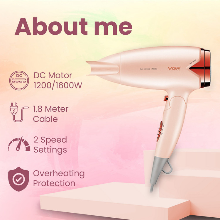 دارای موتور 1600 تا 2000 وات است که از قدرت بالایی برخوردار بوده و فرایند خشک کردن و حالت دهی مو را در مدت زمان کوتاه به خوبی و با کیفیت بالا انجام می دهد. طراحی ارگونومیک ، وزن سبک وقابلیت تاشو این محصول را به یک گزینه مناسب برای مسافرت تبدیل کرده است زیرا فضای بسیار کمی را هنگام مسافرت اشغال می کند همچنین سشوار V-428 قابلیت تنظیم 110/120 و 220/240 ولتاژ مناسب برق شهری و غیر شهری را دارد که مزیت دیگر محصول برای استفاده در سفر است .
