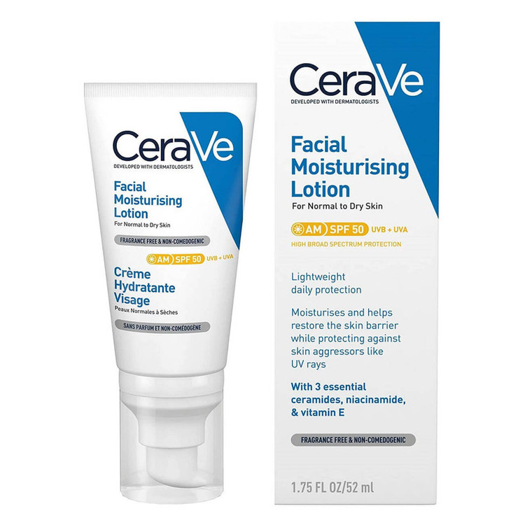 لوسیون مرطوب کننده صورت CeraVe AM SPF50 یک مرطوب کننده سبک روزانه صورت است، با محافظت SPF 50+ UVB/UVA و 3 سرامید ضروری برای کمک به محافظت از سد طبیعی پوست و ایجاد احساس آرامش و آبرسانی به پوست تا 24 ساعت.