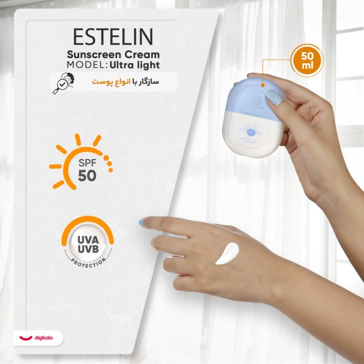 کرم ضد آفتاب بدون رنگ استلین، 50 SPF، مدل ultra light، مناسب انواع پوست و حجم 50 میلیلیتر، محافظت کننده در برابر اشعه U