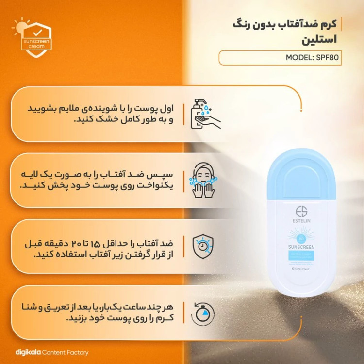 ضدآفتاب بی رنگ استلین Estelin SPF 80 دارای بافتی فوق العاده سبک است و با جذب سریع خود، سفیدی روی پوست بجا نمیگذارد. این محصول از پوست در برابر اشعه های مضر آفتاب محافظت میکند و همچنین از ایجاد عوامل پیری مانند چین و چروک و خطوط ریز روی پوست جلوگیری میکند. این محصول منافذ پوست شما را به حداقل می رساند. همنین دارای فرمولاسیون عالی حاوی مواد تقویت کننده رنگ پوست است که به آرامی رنگ طبیعی پوست شما را تقویت می کند. شما می توانید از ضد آفتاب STELIN به تنهایی به عنوان پرایمر استفاده کنید. ویژگی ظاهری: بیرنگ ناحیه استفاده: صورت SPF: 80 ویژگیهای ضدآفتاب: محافظت کننده در برابر اشعه UVA، محافظت کننده در برابر اشعه UVB، مرطوب کننده، فاقد پارابن ترکیبات: فاقد چربی جلوه رنگ: مات مشخصات-ماندگاری: 3 ساعت مشخصات-ویژگی ظاهری: بیرنگ مشخصات-نوع ضد آفتاب: کرم مشخصات-ناحیه استفاده: صورت مشخصات-SPF: 80 مشخصات-سازگار با پوستهای: همه انواع پوست مشخصات-حجم ضد آفتاب: میلیلیتر مشخصات-ویژگیهای ضدآفتاب: محافظت کننده در برابر اشعه UVA ، محافظت کننده در برابر اشعه UVB ، مرطوب کننده ، فاقد پارابن مشخصات-نوع رایحه: فاقد رایحه مشخصات-PA: PA+++ مشخصات-مزیت مراقبت پوست: ضد پیری مشخصات-راهنمای استفاده: پانزده الی بیست دقیقه قبل از قرار گرفتن در معرض آفتاب، نواحی از پوست خود را که در تماس با نور آفتاب است، با مقدار کافی از کرم بپوشانید. هر 2 ساعت یک بار کرم را تجدید نمایید. همچنین در مواردی مانند تعریق شدید، شنا و یا در ساعاتی از روز که تابش نور شدیدتر است ضد آفتاب را تجدید نمایید. مشخصات-وزن: 100 گرم مشخصات-ترکیبات: فاقد چربی مشخصات-جنس محفظه: پلاستیک مشخصات-سایر مشخصات: قابل استفاده به عنوان پایه آرایش/ آبرسانی عمیق و طولانیمدت پوست/ ترمیمکننده و مرطوبکننده پوست مشخصات-جلوه رنگ: مات مشخصات-نوع محفظه: تیوبی